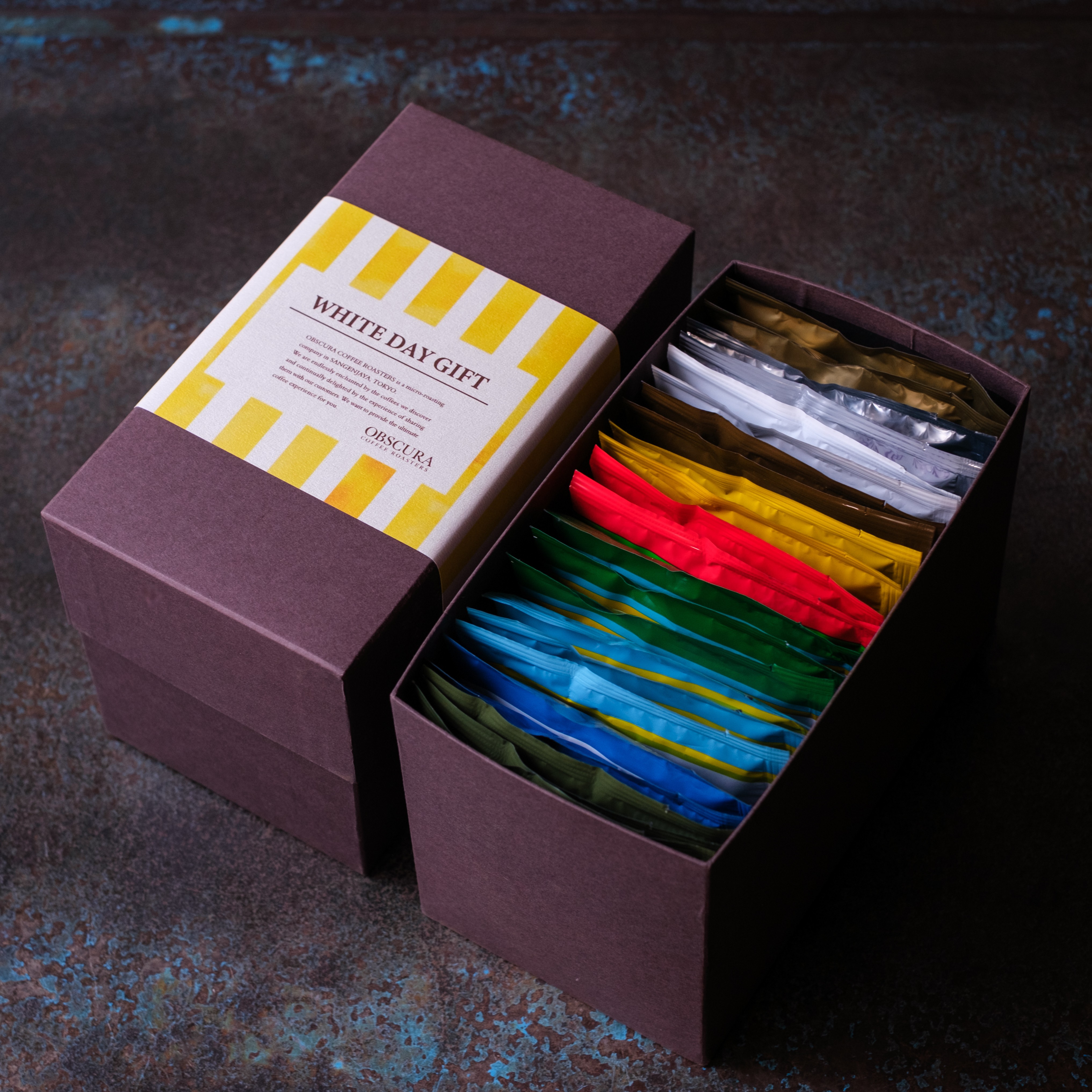 定番のドリップバッグ10種類をアソートにしたギフトセット(18個)に、ホワイトデー用の特別な帯を付けました。
